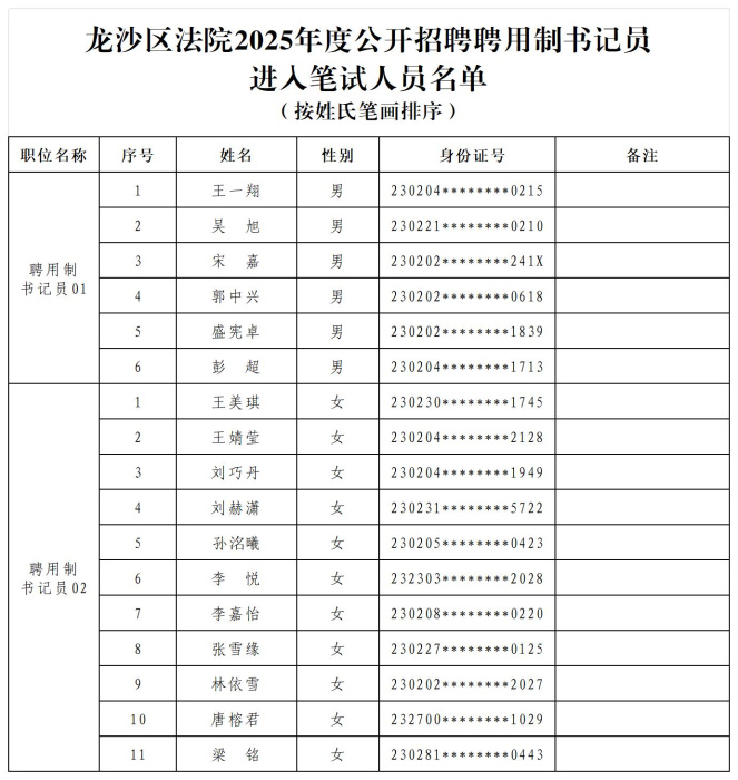 根据《齐齐哈尔市龙沙区人民法院2025年度公开招聘聘用制书记员公告》要求,现将笔试相关事宜通知如下:
