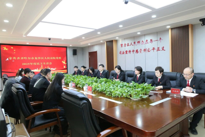 为深入学习贯彻习近平新时代中国特色社会主义思想,全面贯彻落实党的二十届四中全会精神,锲而不舍落实中央八项规定精神,推进作风建设常态化长效化,2月13日下午,中共齐齐哈尔市龙沙区人民法院党组召开2025年度民主生活会,龙沙区委副书记、区长王友良,市法院技术室副主任张晓军,区政府办主任柳春庆,派驻纪检监察组组长高健,区委政法委及督导组相关负责同志到会指导。会议由党组书记、院长李效林主持,党组全体成员参加。