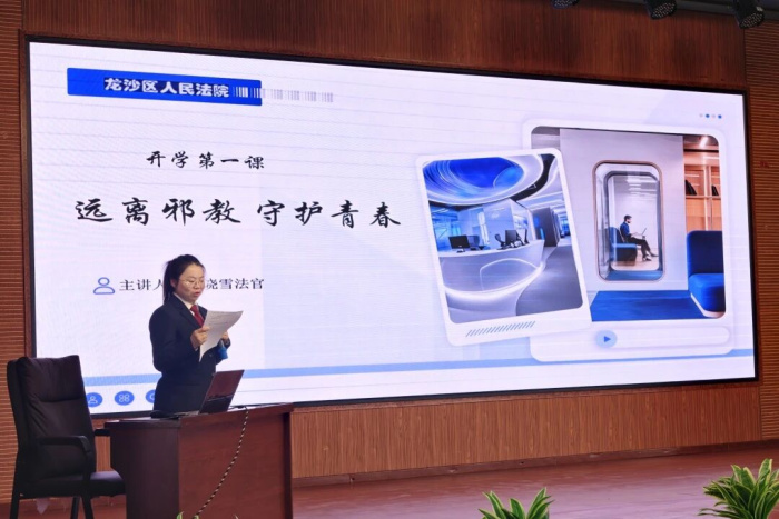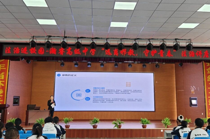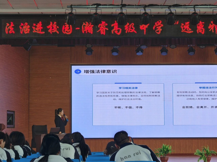 为切实筑牢校园反邪教安全防线,提升青少年识邪、防邪、拒邪意识,护航青少年健康成长,4月3日,龙沙区法院审判管理办公室(研究室)主任、瀚睿高级中学法治副校长田晓雪深入校园,为该校高一、高二年级全体学生,带来了一堂以“远离邪教,守护青春”为主题的开学法治第一课,以司法力量为阳光青春保驾护航。
