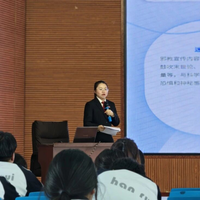随后,她结合近年来的相关案例,详细拆解邪教组织常用的欺骗手段与伪装套路,揭露其以“祈福消灾”“强身治病”“心灵救赎”为幌子拉拢诱骗群众、骗取财物、破坏家庭和谐的违法行径,梳理出邪教在宣传内容、组织形式、行为模式等方面的典型特征,教会同学们快速识别、精准辨别邪教,面对可疑信息和陌生拉拢时保持高度警惕。
